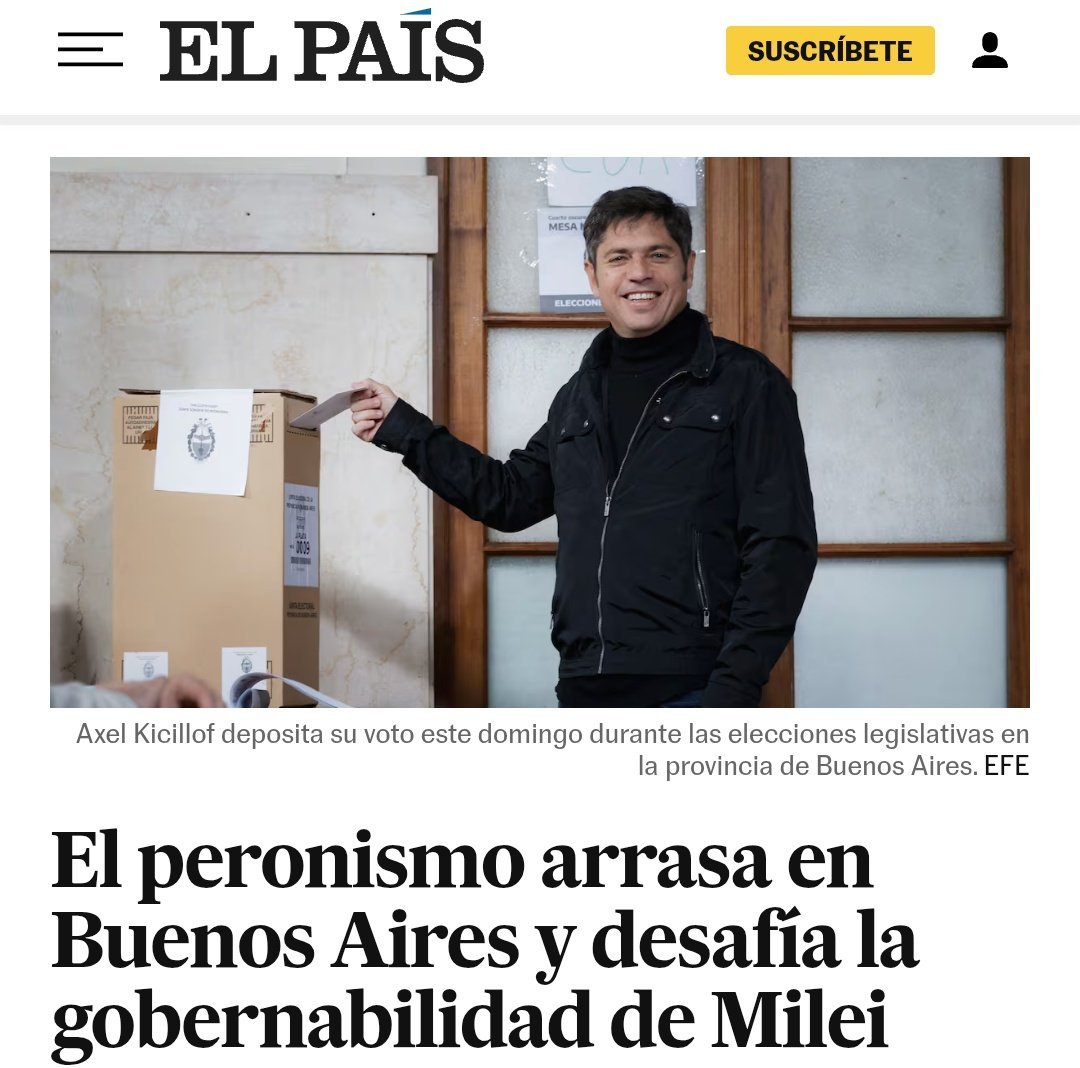 Es mala idea en Argentina dar por muerto al peronismo antes de tiempo. Javier Milei ha debido tomar nota de ello este domingo por la noche, muy a su pesar. Las elecciones legislativas en la provincia de Buenos Aires, donde vive el 40% del censo nacional, asestaron una dura derrota al presidente ultraderechista. Los resultados oficiales, con el 96% de las mesas escrutadas, han otorgado en el conteo general el 47% de los votos al peronismo, reunido en sus variadas versiones en el frente Fuerza Patria, contra el 33,8% de La Libertad Avanza, más de 13 puntos de diferencia. No alcanzó al Gobierno nacional ni siquiera la fusión con el Pro, el partido del expresidente Mauricio Macri, reducido ahora a una fuerza minoritaria dentro del armado nacional del partido oficial.