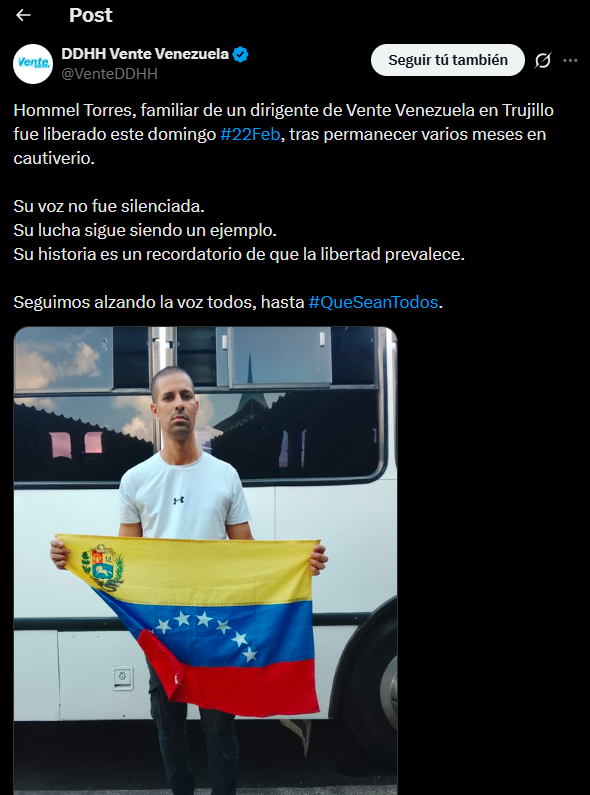 El Comité de Derechos Humanos del partido Vente Venezuela, confirmó este domingo 22 de febrero a través de su cuenta oficial en X, la liberación de Hommel Torres, familiar de un dirigente de la organización en el estado Trujillo, luego de permanecer varios meses en cautiverio bajo el control del régimen chavista.