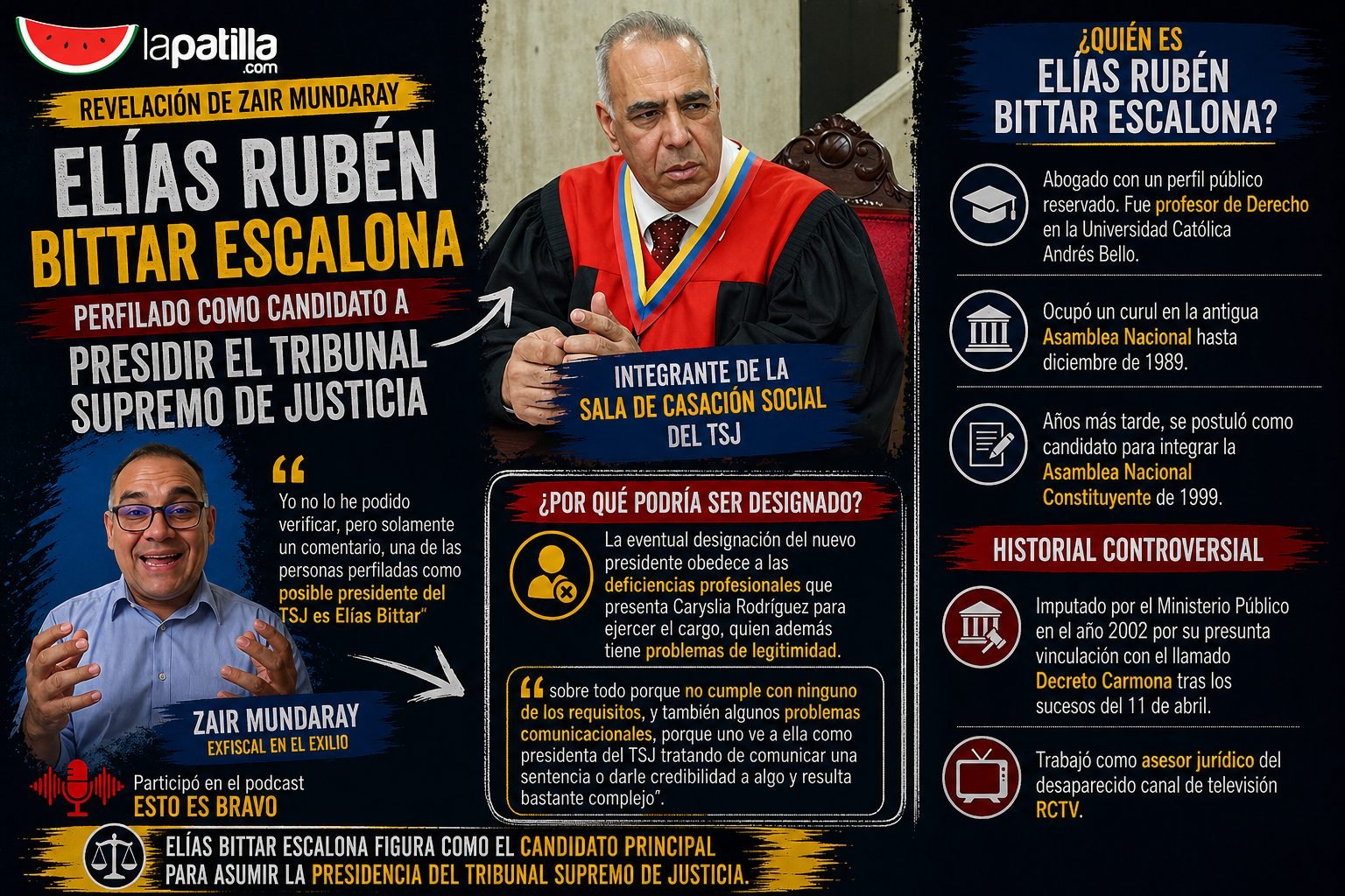 El abogado indicó en su participación en el podcast Esto es Bravo que el actual integrante de la Sala de Casación Social supliría a la actual titular de la máxima corte. “Yo no lo he podido verificar, pero solamente un comentario, una de las personas perfiladas como posible presidente del TSJ es Elías Bittar”, detalló Mundaray.
