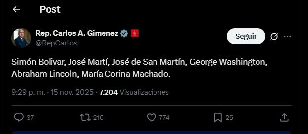 Poco tiempo después de la publicación anterior, decidió publicar otro X, donde Giménez enumeró una lista de figuras históricas asociadas a la independencia y la lucha por la libertad en América y Estados Unidos: “Simón Bolívar, José Martí, José de San Martín, George Washington, Abraham Lincoln, María Corina Machado”